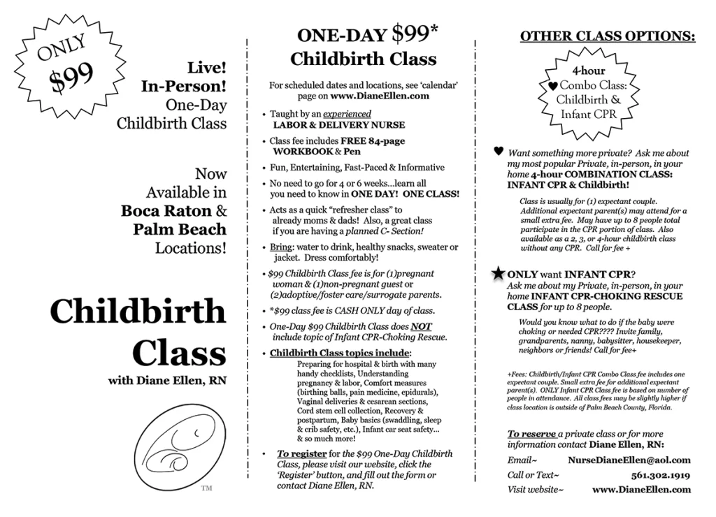 Classes are usually held one Saturday or one Sunday of each month. The location of the class is usually in a hospital setting or doctor’s office. The workshop starts at 9am and ends at 5pm. Times, dates, and locations may vary depending on your instructor. Private classes are also available in your home.